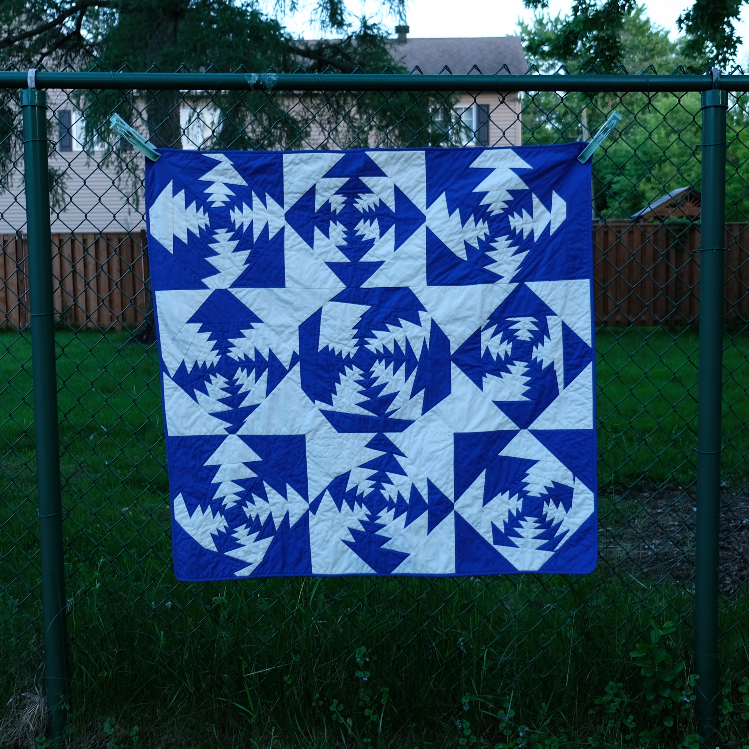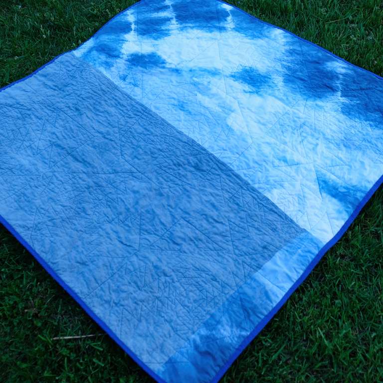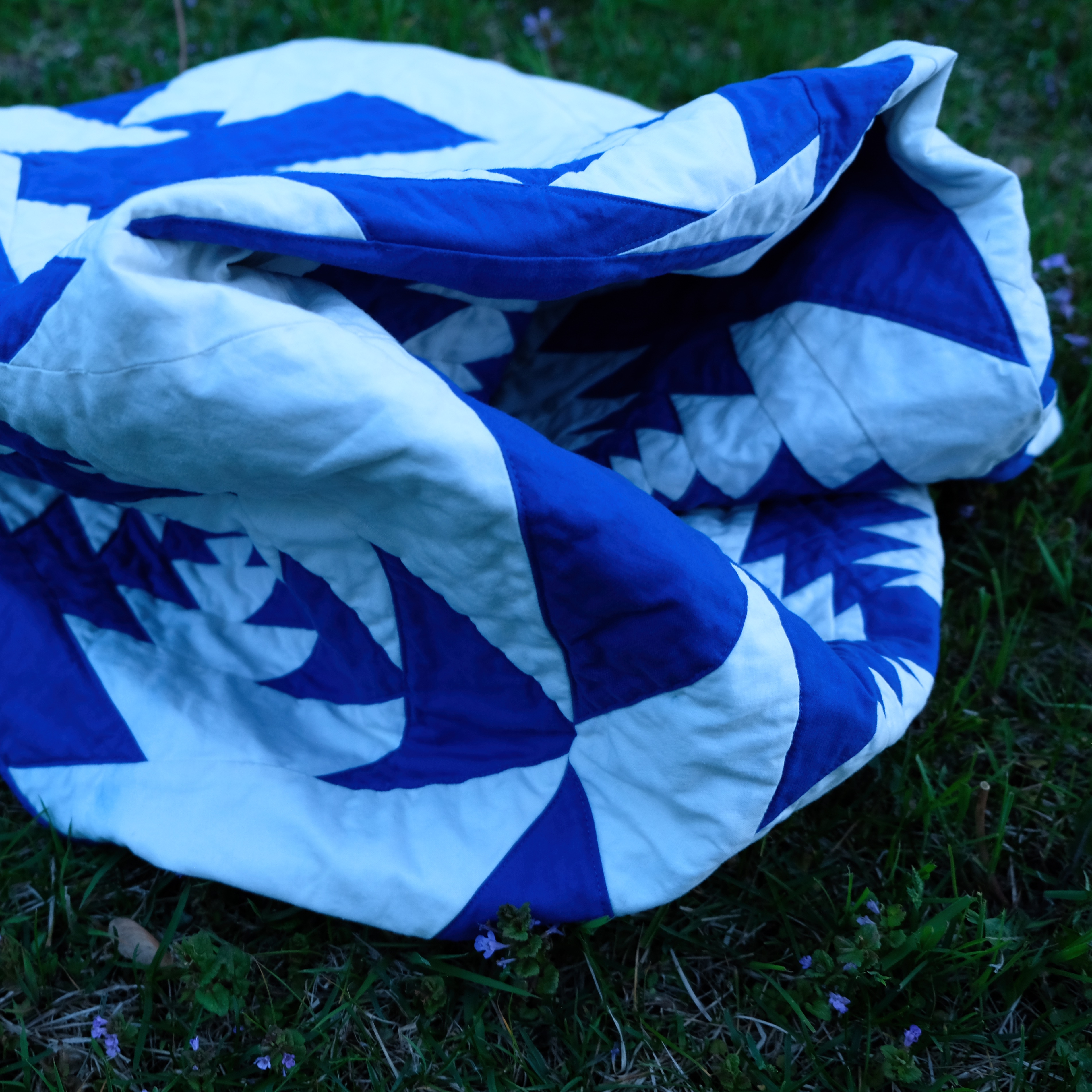 This quilt is a celebration of the colour blue from the Gilbert Baker Pride flag - he intended the colour to represent harmony. The design features nine "wonky pineapple" blocks, each made up of many familiar parts and all working together as one in harmony to make a giant star. My idea with using a queer version of these familiar blocks is to symbolize the idea that we are all made up of essentially the same pieces, with each in our own distinct way coming together to create a harmonious and unified whole. The back of the quilt is hand dyed fabric from Bex and Luke.