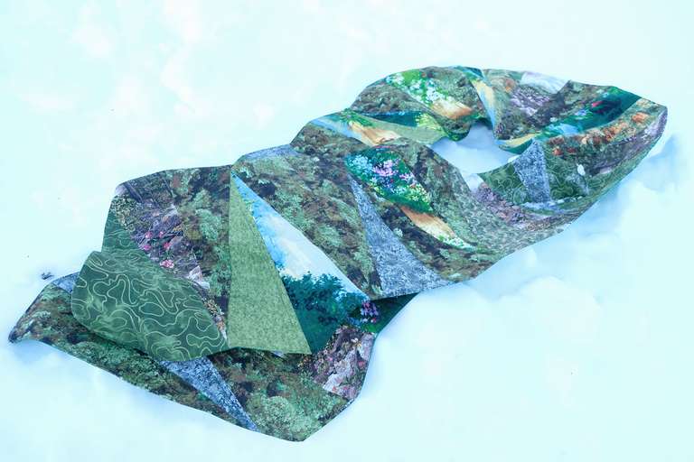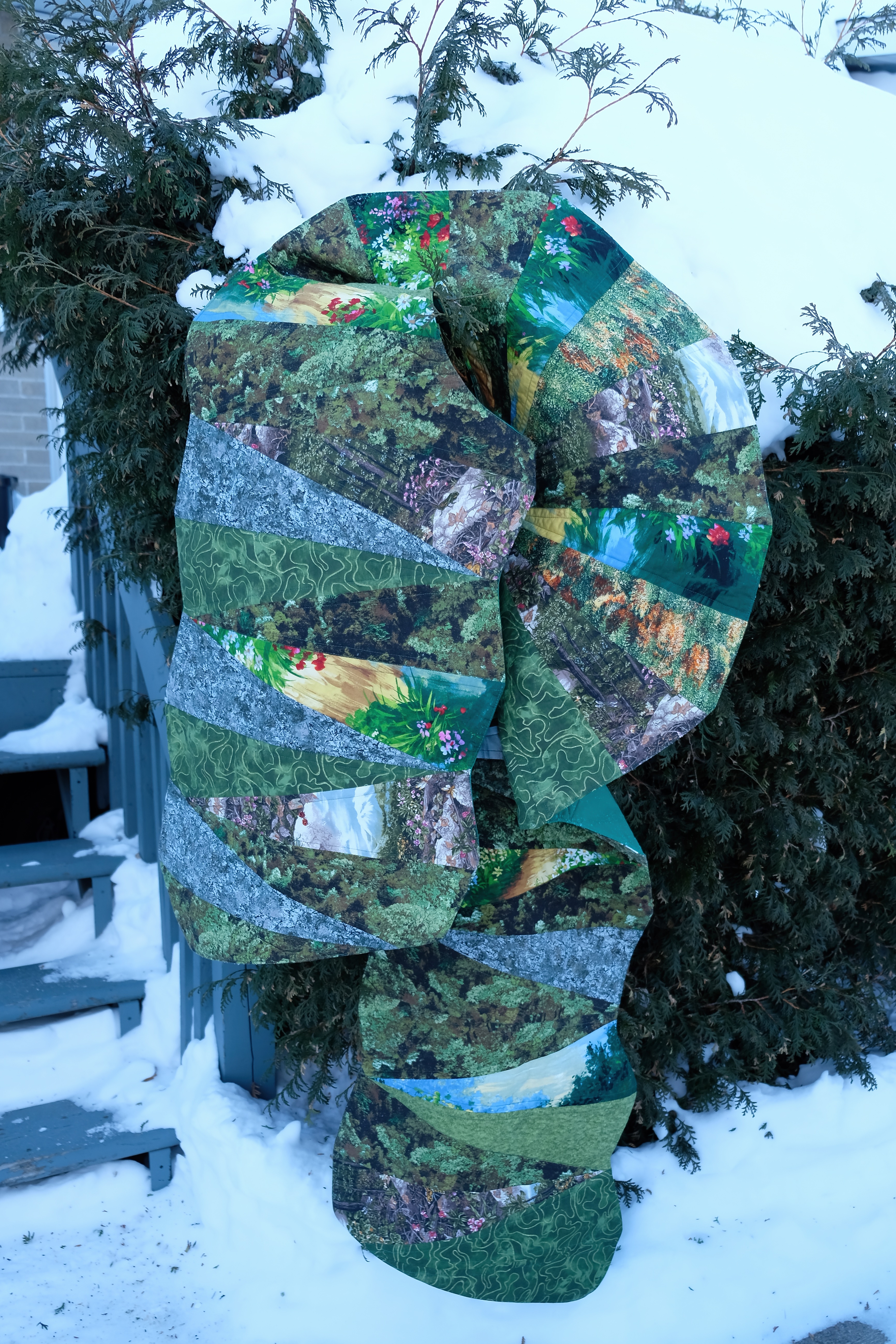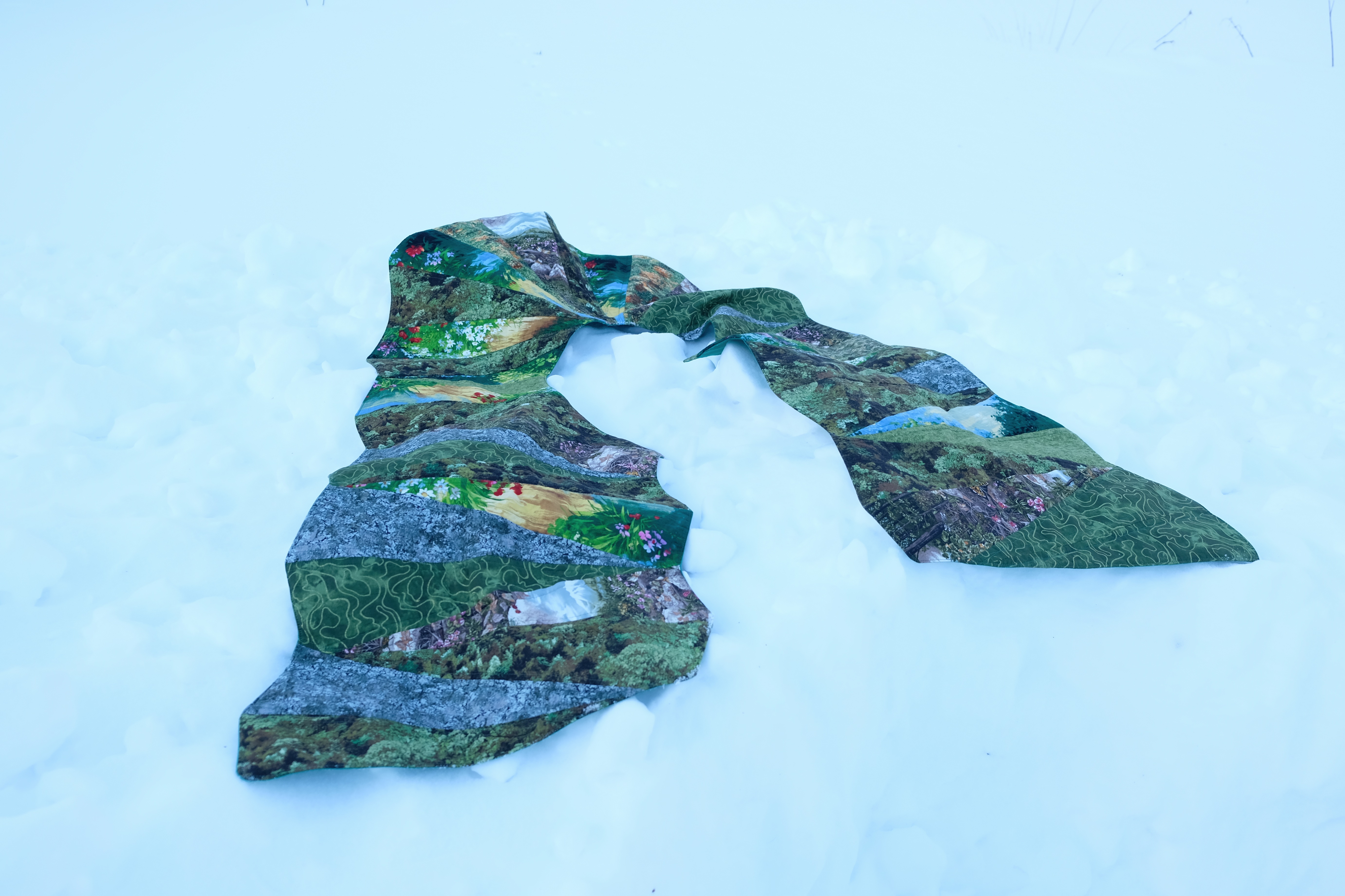 This stole celebrates the green stripe from Gilbert Baker's Pride flag, representing nature. The design wraps the wearer in a quilted landscape of rolling hills, stone formations, and wildflowers - a reminder that queerness exists throughout the natural world. Another piece in my Progress Pride series, where I am exploring each colour's meaning through wearable quilts. Using the gore shape over and over - fashion-inspired triangular inserts that create movement and flow - this piece has a clean pillowcase binding thanks to @ssparrowinflight expert advice. Fabric is all from @swansonsfabrics